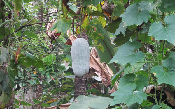A chameleon expertly camouflaged among lush green neem leaves in a natural environment.